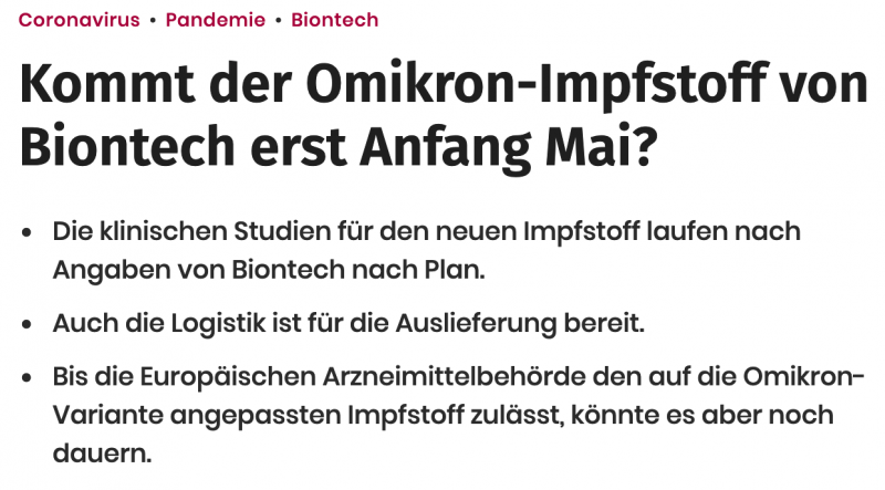 "Die klinischen Studien liefen nach Plan" - das ist spannend, denn die einzigen bisher veröffentlichten Tierversuchs-Antikörper-Studien zeigten keinerlei Vorteil des Omikron-Impfstoffs gegenüber dem Original-Impfstoff bezüglich Omikron...