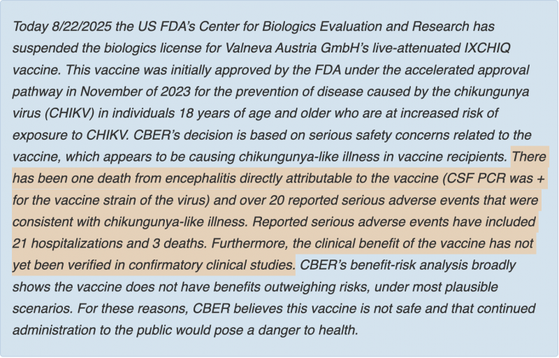 Am 22.08.2025 widerrief die US-amerikanische Gesundheitsbehörde FDA die Zulassung des Lebendimpfstoffs gegen das Chikungunya-Virus, Ixchiq® der Firma Valneva, wegen einer Häufung schwerer und schwerster Nebenwirkungen und Zweifeln an der klinischen Wirksamkeit des Impfstoffs.