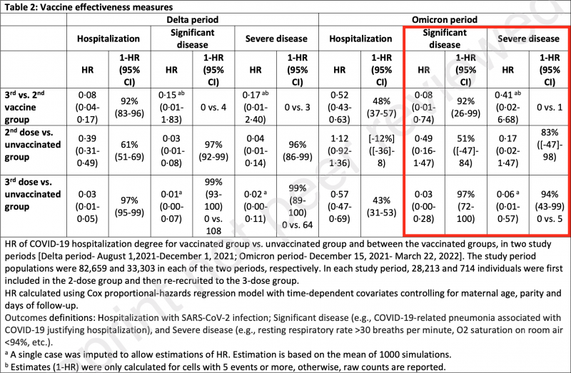 - die dreimalige Impfung hat einen solchen Schutzeffekt, man beachte aber die angesichts der hohen Zahl beobachteter Schwangerer sehr niedrigen absoluten Fallzahlen und die sich daraus ergebenden sehr großen Vertrauensbereiche