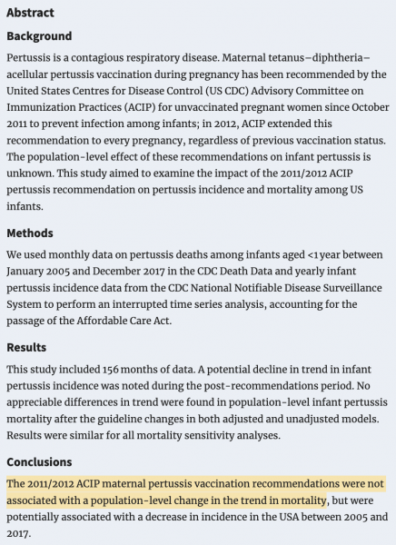 Die Autoren halten einen tendenziellen Rückgang der Erkrankungszahlen für möglich (! - "potential decline in trend"), ein Effekt auf die Zahl der Keuchhusten-bedingten Todesfälle bei Säuglingen ließ sich nicht feststellen ("The 2011/2012 ACIP maternal pertussis vaccination recommendations were not associated with a population-level change in the trend in mortality") - dies ist aber das zentrale Argument für die Impfempfehlung.