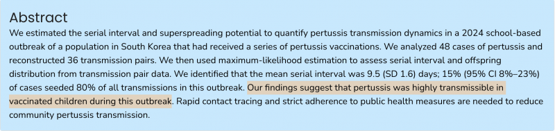 Die Autoren schlussfolgern, dass Keuchhusten unter geimpften (Kindern) hochgradig ansteckend ("highly transmissible") ist, was jede Kokonstrategie, wie sie die STIKO empfiehlt, vollständig ad absurdum führt... .
