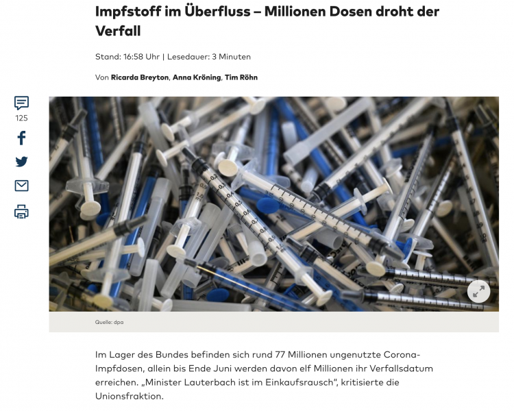 Im Lager des Bundes befinden sich rund 77 Millionen ungenutzte Corona-Impfdosen, allein bis Ende Juni werden davon elf Millionen ihr Verfallsdatum erreichen. „Minister Lauterbach ist im Einkaufsrausch“, kritisierte die Unionsfraktion.