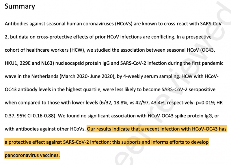 Recent Infection With HCoV-OC43 Is Associated With Protection Against Sars-Cov-2 Infection by A.H. Ayesha Lavell, Jonne J. Sikkens, Arthur WD Edridge, Karlijn van der Straten, Melissa Oomen, David TP Buis, Michiel Schinkel, Judith A. Burger, Meliawati Poniman, Menno D. de Jong, Godelieve J. de Bree, Edgar JG Peters, Yvo M. Smulders, Rogier Sanders, Marit J. van Gils, Lia van der Hoek, Marije Bomers :: SSRN