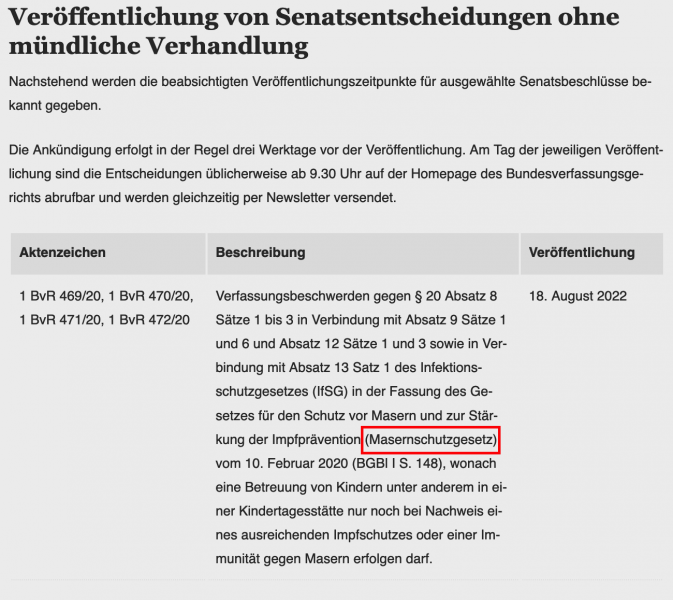 Masernimpfpflicht: BVerfG entscheidet am 18.08.2022 - ohne mündliche Verhandlung