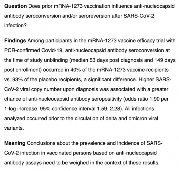 In Serumproben aus den Moderna-Zulassungsstudien konnte gezeigt werden, dass Geimpfte im Falle einer Durchbruchsinfektion deutlich seltener Anti-nucleocapsid-Antikörper (anti-N-Abs) bilden als Ungeimpfte (Placebo-Empfänger) bei einer Erstinfektion. anti-N-Abs entstehen als Teil der humoralen Immunabwehr gegen Sars-CoV-2-Infektion, nicht aber nach der Impfung, die nur das Spike-Protein codiert und können daher helfen, diese Immunreaktionen zu differenzieren.