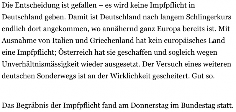 NZZ: Impfpflicht: Der Versuch eines weiteren deutschen Sonderwegs ist an der Wirklichkeit gescheitert