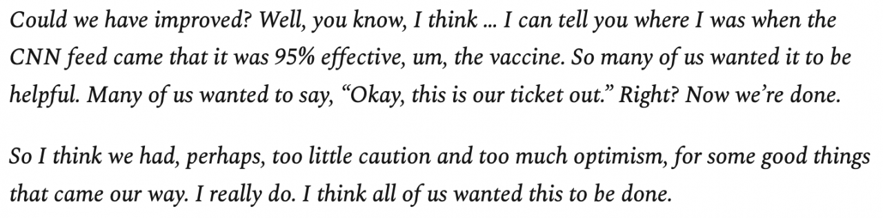 Hier die Äußerungen von Rochelle Walensky, Direktrice der CDC und ein link zu einem klugen, einordnenden Artikel