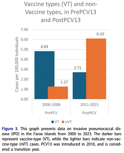 Eine dänische Studie untersuchte über den Zeitraum von 2000 - 2023 die Häufigkeit schwerer Pneumokokken-Infektionen (IPD für invasive pneumococcal disease) auf den Faröer-Inseln, in allen Altersgruppen und für verschiedenste Serotypen, unterschieden nach denen, die in den Impfstoffen enthalten sind (VT für vaccine-type) und denen, die dies nicht sind (nVT für non vaccine-type).
