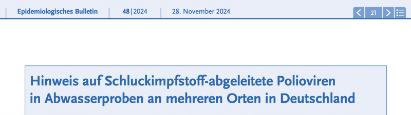 Obwohl die Abwasseruntersuchung auf Krankheitserreger in D weiterhin nicht flächendeckend vorgenommen wird, wurden jetzt auch hier Polioviren aus dem Schluckimpfstoff gegen Kinderlähmung nachgewiesen. Das RKI geht aufgrund der verschiedenen Nachweisorte davon aus, dass die entsprechenden Impfviren (Poliovirus Typ 2, der als Wildvirus offiziell ausgerottet ist) in Deutschland zirkulieren.