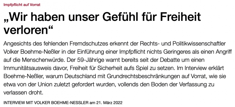Angesichts des fehlenden Fremdschutzes erkennt der Rechts- und Politikwissenschaftler Volker Boehme-Neßler in der Einführung einer Impfpflicht nichts Geringeres als einen Angriff auf die Menschenwürde. Der 59-Jährige warnt bereits seit der Debatte um einen Immunitätsausweis davor, Freiheit für Sicherheit aufs Spiel zu setzen. Im Interview erklärt Boehme-Neßler, warum Deutschland mit Grundrechtsbeschränkungen auf Vorrat, wie sie etwa von der Union zuletzt gefordert wurden, vollends den Boden der Verfassung zu verlassen droht.