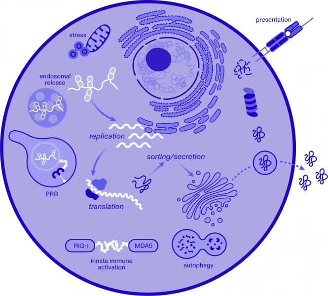 Bei so genannten "selbstreplizierenden mRNA-Impfstoffen srRNA" wird eine Form der RNA verimpft, die die Fähigkeit hat, sich im Körper der Geimpften selbst zu vervielfältigen - sie bringt, vereinfacht gesagt, das Bordwerkzeug mit, sich selbst zu kopieren.