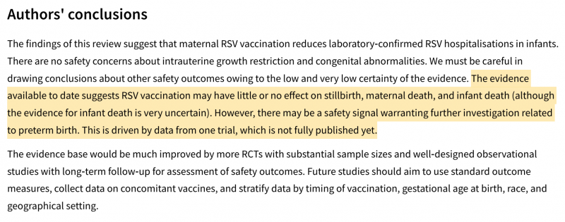 die Autoren halten das Risikosignal für eine mögliche Erhöhung des Frühgeburtsrisikos durch die Impfung für möglich und fordern hier mit Nachdruck mehr, größere und bessere Studien. Die bisherigen Daten (und damit die Impfempfehlung) beruhen auf einer einzigen Studie, deren Ergebnisse nicht einmal vollständig veröffentlicht sind.