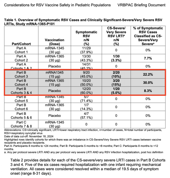 Nun scheint sich diese Geschichte mit den neuen RSV-mRNA-Impfstoffen von Moderna zu wiederholen - auch hier: wesentlich mehr und wesentlich mehr schwere und schwerste RSV-Erkrankungen in der Verum-Gruppe verglichen mit den Kindern, die Placebo erhielten - die Zulassungsstudie wurde bereits im Sommer 2024 gestoppt, die US-amerikanische Gesundheitsbehörde FDA hat die dem zugrundeliegenden Zahlen kaum 3 Monate später (!) auch schon veröffentlicht (s. Graphik).
