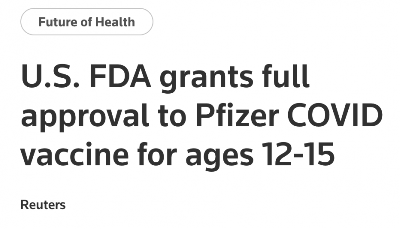 U.S. FDA grants full approval to Pfizer COVID vaccine for ages 12-15 | Reuters