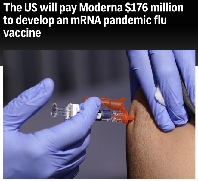Die US-amerikanische Regierung zahlt schon einmal $ 176.000.000 an Moderna, damit die schneller einen (natürlich) mRNA-Impfstoff gegen Vogelgrippe entwickeln, den sie dann wieder teuer an die US-Regierung verkaufen können.