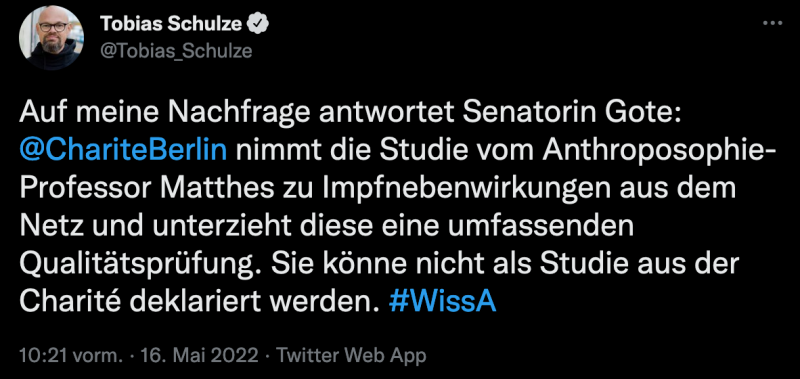 Auf meine Nachfrage antwortet Senatorin Gote: @ChariteBerlin nimmt die Studie vom Anthroposophie-Professor Matthes zu Impfnebenwirkungen aus dem Netz und unterzieht diese eine umfassenden Qualitätsprüfung. Sie könne nicht als Studie aus der Charité deklariert werden. #WissA