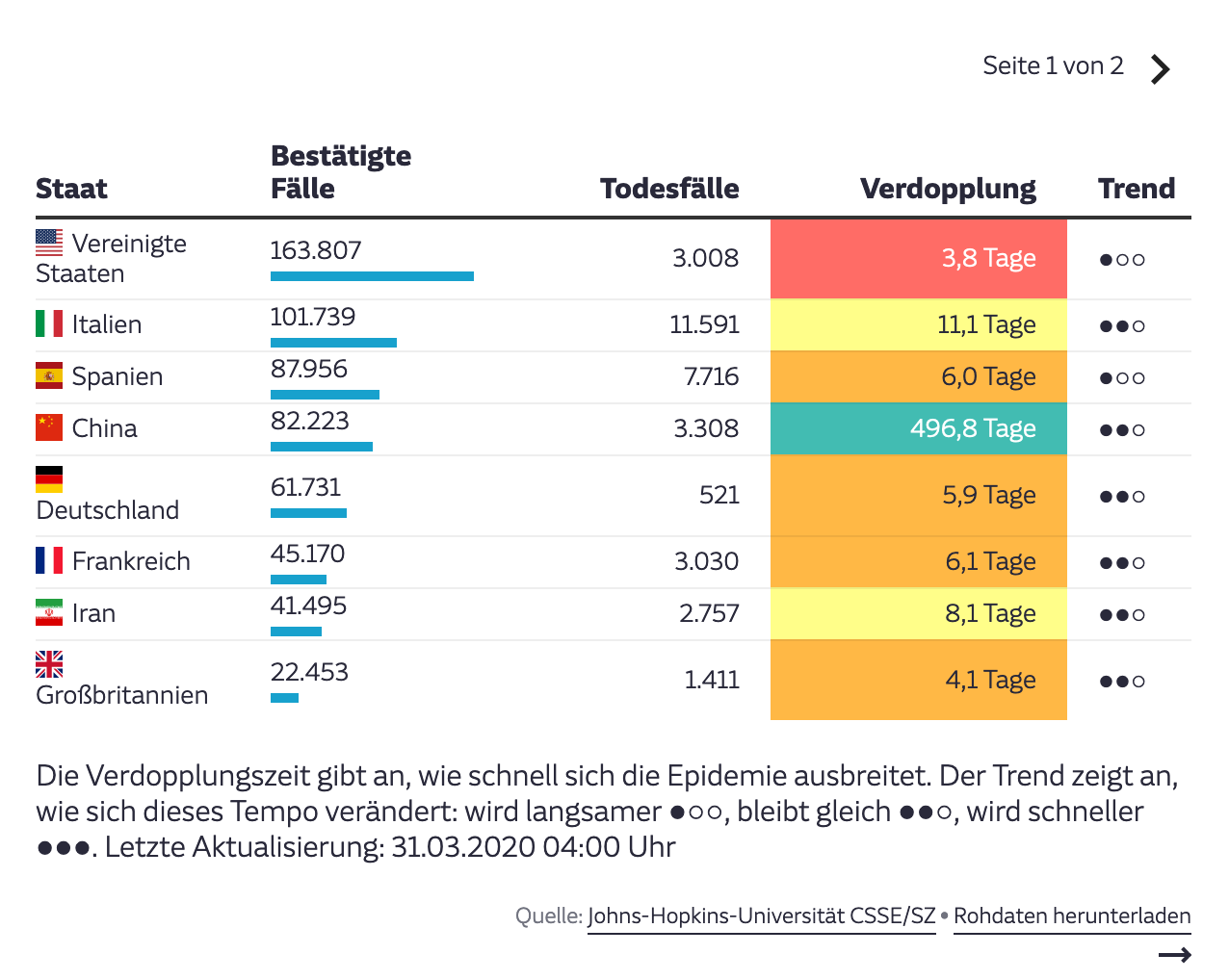 Am 30.03. titelt die Tagesschau in ihrem Liveblog (Hervorhebung von mir): "Laut Johns-Hopkins-Universität jetzt rund 64.000 Infektionen und 560 Todesfälle in Deutschland" und die SZ liefert am 31.03. wie jeden Tag auf der Titelseite ein ähnliches Bild: