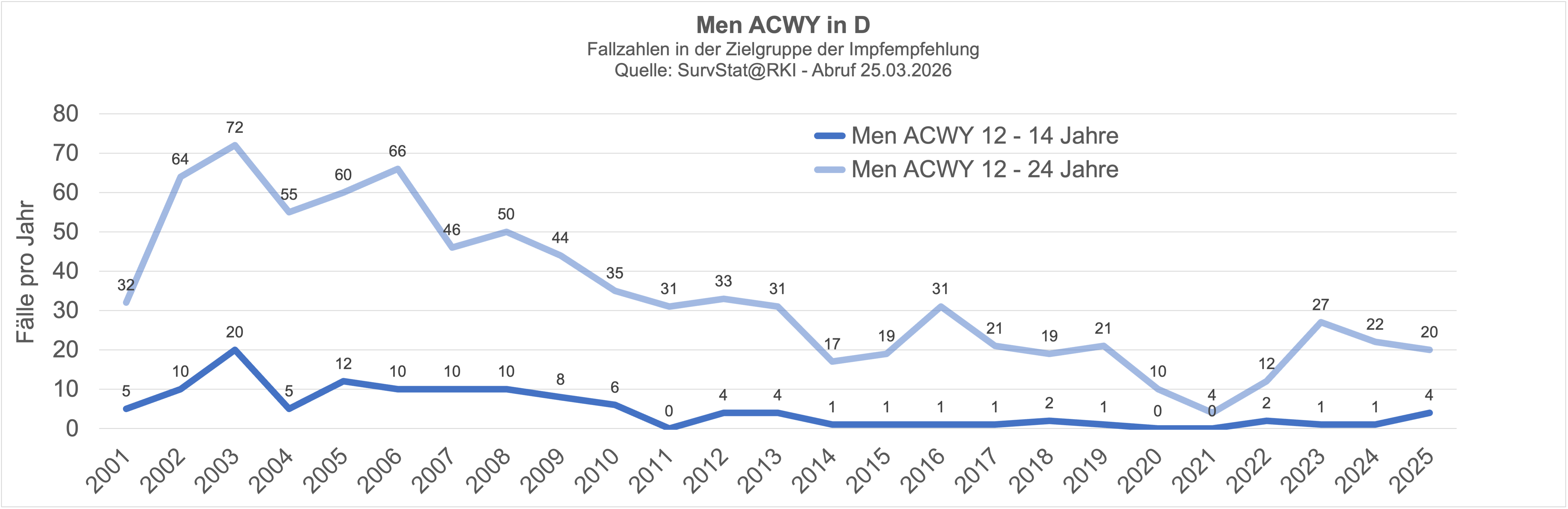 Die Fallzahlen nehmen seit 20 Jahren "deutlich und relativ stetig" (RKI 2024) ab, die Ursache dafür ist unklar und nicht in den Impfprogrammen begründet, da sich diese Trends auch in Ländern zeigen, die nicht gegen Meningokokken impfen.