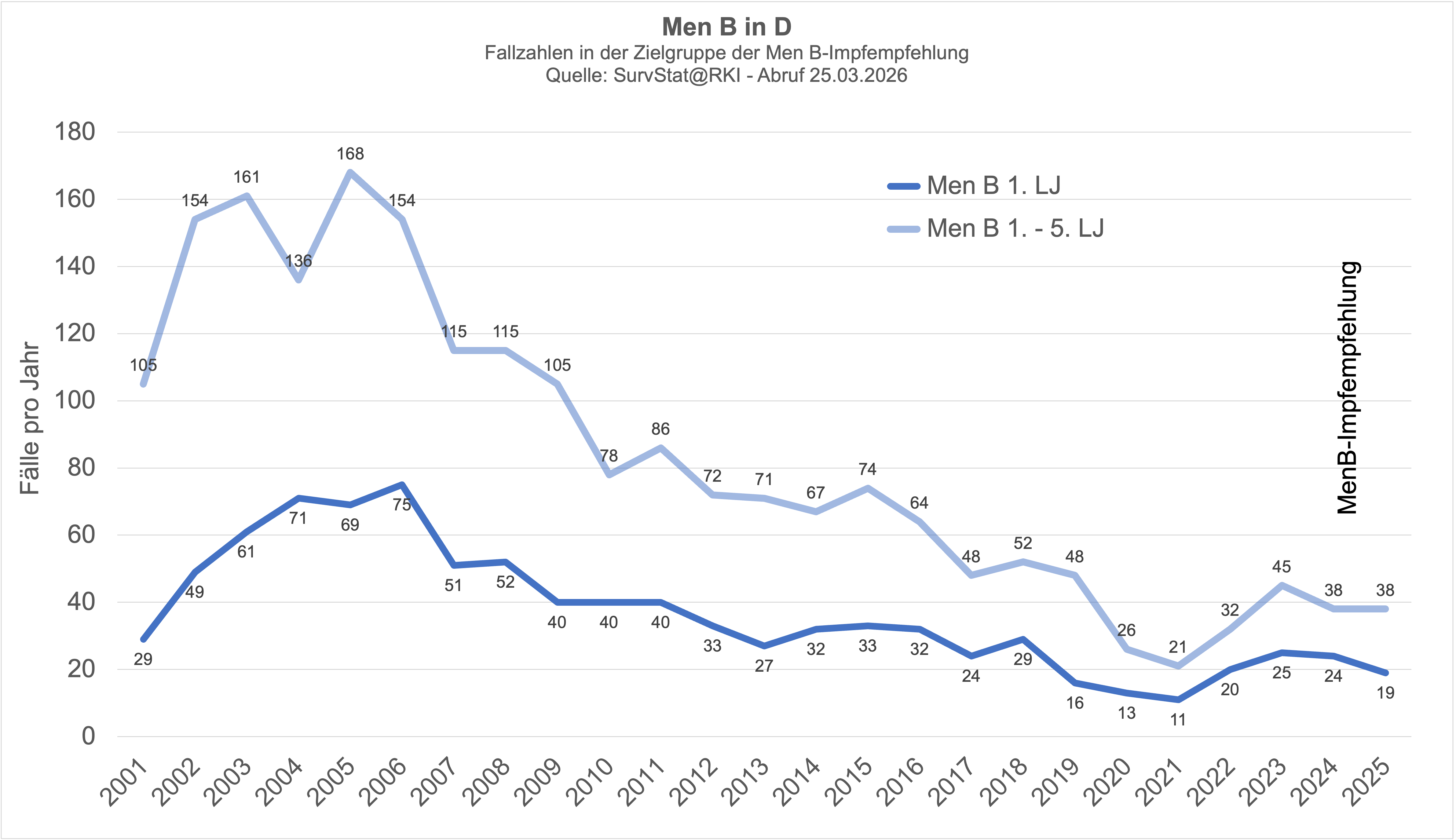 Seit Januar 2024 ist in Deutschland als einem der wenigen europäischen Länder jetzt die MenB-Impfung für Säuglinge empfohlen - mit der Empfehlung einer Nachholimpfung bis zum 5. Lebensjahr. Die Sinnhaftigkeit dieser extrem schlecht verträglichen und nur fraglich wirksamen Impfung lässt sich aus den Erkrankungszahlen (und vor allem: deren auch von der STIKO freimütig eingeräumten Verlauf der letzten vielen Jahre) nicht zwanglos ableiten.