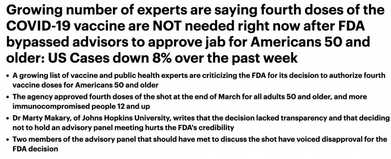 A growing list of vaccine and public health experts are criticizing the FDA for its decision to authorize fourth vaccine doses for Americans 50 and older.