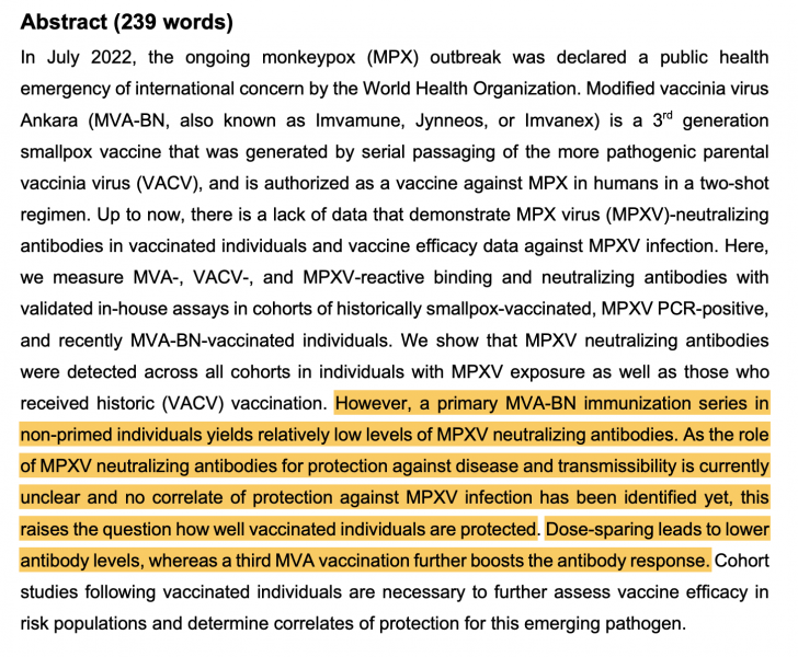 Da kein sicherer Wert für den Antikörpertiter bekannt ist, ab dem ein zuverlässiger klinischer Schutz anzunehmen ist, werten die Autoren dieser relativ kleinen Laborstudie den Schutz durch den Impfstoff gegen Affenpocken als fraglich.