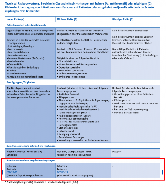 Die "Kommission für Krankenhaushygiene und Infektionsprävention" (KRINKO) am RKI hat ihre Impfempfehlungen für Beschäftigte im Gesundheitswesen aktualisiert und um die Covid-19-Impfung ergänzt.