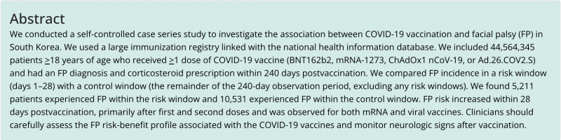 Eine große (N = > 44.000.000) südkoreanische Registerstudie bestätigte sowohl für mRNA-Impfstoffe, als auch für Virusvektor-Impfstoffe ein signifikant erhöhtes Risiko, innerhalb von 28 Tagen nach der Impfung eine Gesichtsnervenlähmung (Facialisparese) zu erleiden.