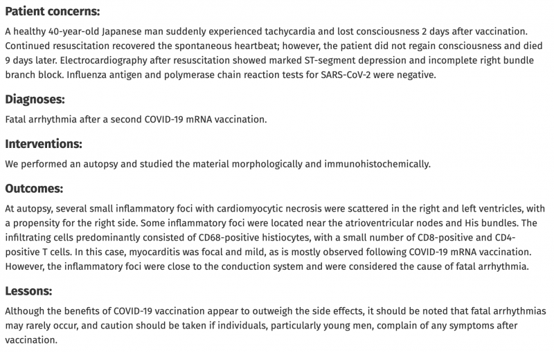 Die englische Expertengruppe @hartgroup_org weist auf eine japanische Veröffentlichung hin, die den Todesfall eines 40-Jährigen einige Tage nach der zweiten Covid-Impfung untersuchte.