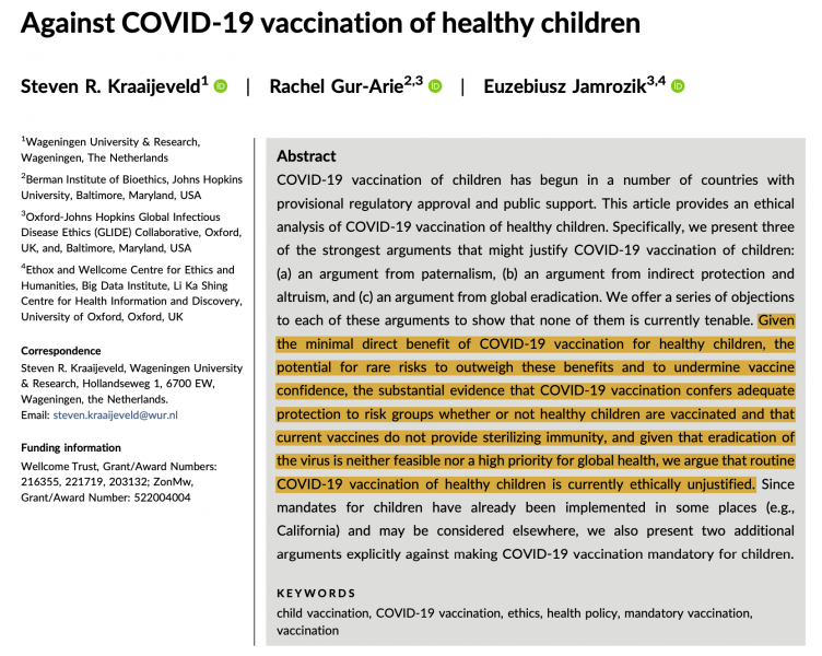 "COVID-Impfung von Kindern ethisch nicht zu rechtfertigen" - so das Fazit einer Arbeit von: Medizinethikern