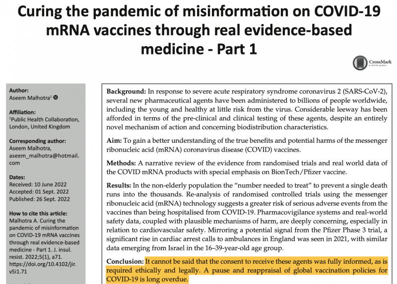 Curing the pandemic of misinformation on COVID-19 mRNA vaccines through real evidence-based medicine - Part 1 | Malhotra | Journal of Insulin Resistance