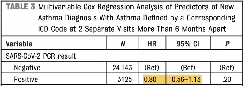 Es zeigte sich nicht nur keine Erhöhung des Risikos (das steht so im abstract der Studie), sondern, vor allem bei Kindern, bei denen die Diagnose Asthma bronchiale über einen längeren Zeitraum wiederholt gestellt wurde, sogar eine Risikoverringerung, die nur knapp nicht signifikant ist (Hazard Ratio 0,80 (0,56-1,13)) und die die Autoren der Studie gut in einer der Tabellen der Studie (Table 3) verstecken. Es könnte also sein, dass eine Covid-Infektion das Asthmarisiko bei Kindern verringert... .