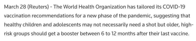 The World Health Organization has tailored its COVID-19 vaccination recommendations for a new phase of the pandemic, suggesting that healthy children and adolescents may not necessarily need a shot but older, high-risk groups should get a booster between 6 to 12 months after their last vaccine.
