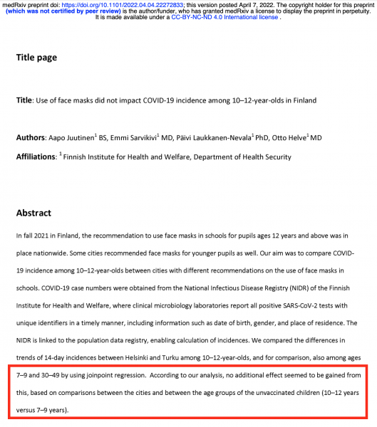 Use of face masks did not impact COVID-19 incidence among 10–12-year-olds in Finland | medRxiv