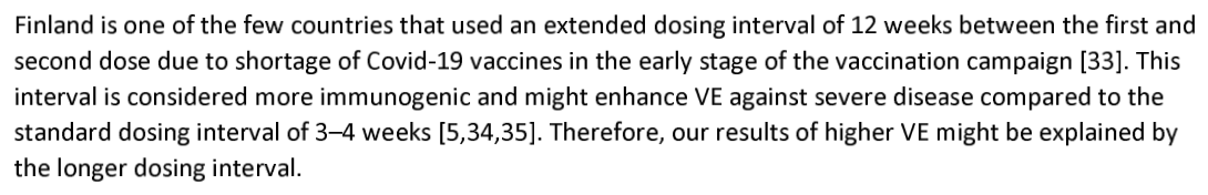 Finnland hatte aufgrund von Impfstoffknappheit gerade zu Beginn der Kampagne das Dosisintervall zwischen den ersten Impfdosen auf 12 Wochen verlängert - mittlerweile weiß man, dass diese Strategie die Wirksamkeit der Impfung gerade gegen schwere Erkrankungen wesentlich verbessert (Israel: 3 Wochen, D meist 3 - 9 Wochen).