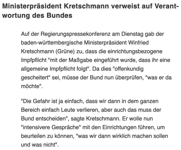Forderungen nach Abschaffung der bereichsbezogenen Impfpflicht werden lauter... Kretschmann verweist auf den Bund...