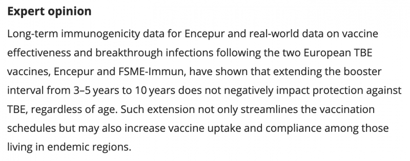Eine aktuelle systematische Literaturübersicht bestätigt rechtzeitig zur alljährlichen Zecken-Hysterie, dass Auffrischimpfungen nach einer FSME-Grundimmunisierungen höchstens alle 10 Jahre vorgenommen werden müssen . Im Gegensatz hierzu verweist die STIKO zu dieser Frage lediglich auf die Fachinformationen der Hersteller, die Auffrischungen alle 3 - 5 Jahre empfehlen (was die Anzahl der verkauften Impfdosen durchaus in ihrem Sinne zwangsläufig erheblich erhöht...).