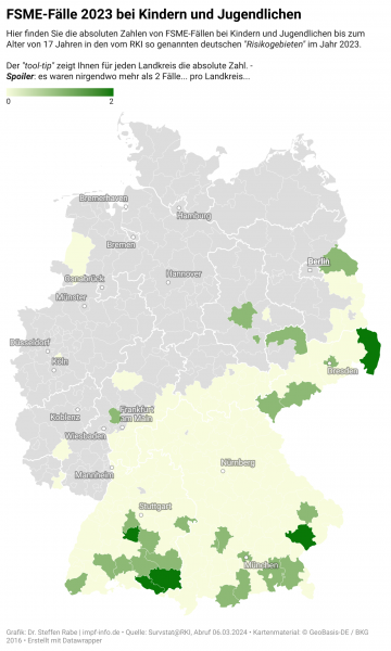 Sie finden hier eine Darstellung aller deutschen vom RKI so genannten "FSME-Risikogebiete" und die Zahl der dort 2023 aufgetretenen FSME-Fälle bei Kindern und Jugendlichen (tooltip funktioniert auf der Originalseite hier):