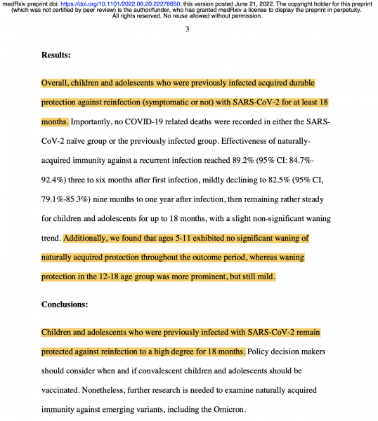 Genesen: bei Kindern schützt natürliche Immunität mindestens 18 Monate vor Reinfektion (!) - ohne relevantes Nachlassen der Immunität über die Zeit