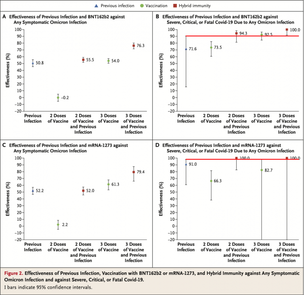 - der Effekt einer "hybriden Immunität" (Infektion plus 2 Impfungen) als Schutz vor schwerer Erkrankung ist nicht eindeutig: teilweise absurd große Vertrauensbereiche überlappen sich in jedem Fall mit denen der Schutzeffekte einer ausschließlich natürlichen Immunität nach Infektion