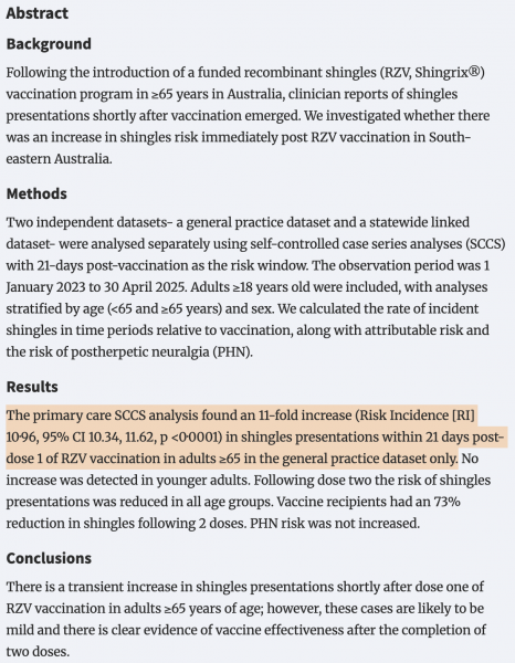 Eine australische retrospektive Fall-Kontroll-Studie wies nach, dass das Risiko, in den drei Wochen nach der H. zoster-Impfung Shingrix® an einer Gürtelrose zu erkranken für Ältere (die Zielgruppe der Impfung) um das 11-fache (!) erhöht ist.