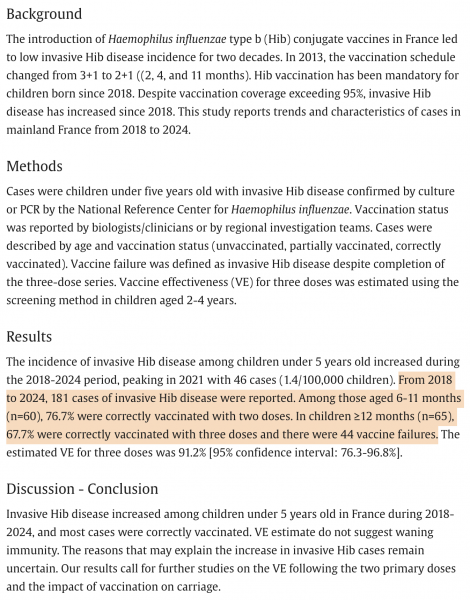 Jetzt berichten Forscher über einen deutlichen Anstieg von HiB-Erkrankungen bei Kindern in Frankreich, das - auch durch eine restriktive Impfpflicht - Durchimpfungsquoten von 95% und mehr hat. Mehr als 2/3 der betroffenen Kinder sind altersgerecht vollständig geimpft und erkranken dennoch durch HiB - ein auch nach eingehender Untersuchung der Fälle unerklärbares Phänomen.