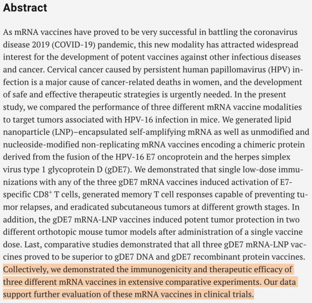Eine aktuelle Studie unter der Mitwirkung von BioNTech-Mitarbeitern verglich die Effektivität verschiedener mRNA-HPV-Impfstoffe in der Behandlung HPV 16-assoziierter Tumore bei Mäusen. Die Impfstoffe codierten für die Produktion eines künstlich designten Proteins, das das Immunsystem stimuliert, HPV 16-spezifische Eiweissstoffe anzugreifen. Verwendet wurde sowohl Impfstoffe mit nicht-replizierender als auch solche mit selbstreplizierender mRNA.