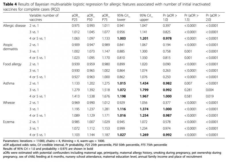 Die Autoren fanden jedoch eine signifikant Erhöhung des Risikos für Asthma bronchiale, Ekzem und andere allergische Erkrankungen in Abhängigkeit von der Anzahl der verschiedenen Impfstoffe im ersten Lebenshalbjahr: gegen je mehr Erkrankungen mit Nicht-Lebend-Impfungen geimpft wurde, desto höher war das Risiko für die genannten allergischen Erkrankungen.