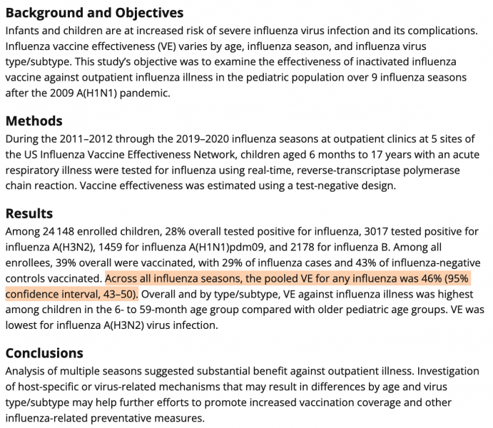 Eine aktuelle Analyse der Impfstoff-Effektivität (relative Risikoverringerung VE) von aktuellen Influenza-Impfstoffen bei Kinder über die Jahre 2011 - 2020 findet eine mittlere VE von 46% zum Verhindern einer Influenza-Erkrankung.
