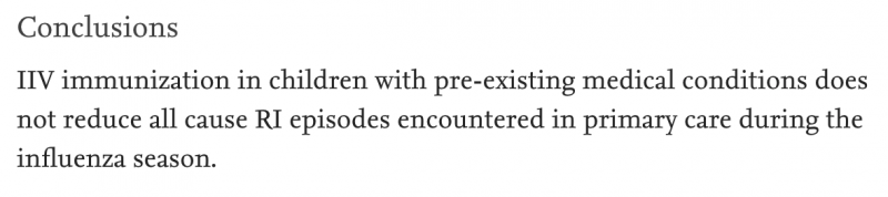 Eine große niederländische Studie über zwölf Influenza-Saisons (insgesamt fast 40.000 Kinder-Jahre...) fand keinen Effekt der inaktivierten Influenza-Impfung (IIV) auf die Häufigkeit von Atemwegsinfekten bei Kindern mit Vorerkrankungen.