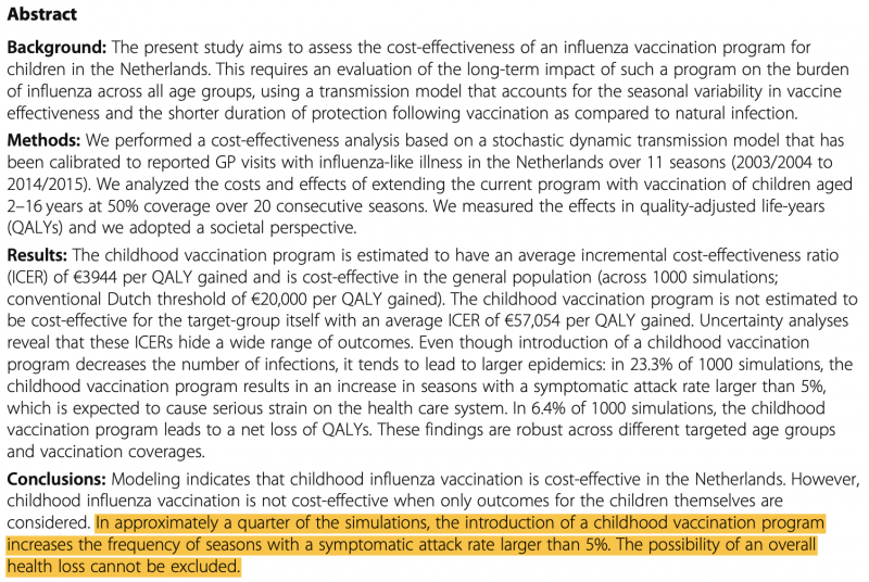 Bezogen auf die Gesamtbevölkerung (für die Kinder bei der Influenza - anders als bei Covid - als relevanter Teil von Infektketten wirken) ist diese Analyse klar positiv, bezogen auf einen Nutzen der geimpften Kinder selbst ebenso klar negativ.