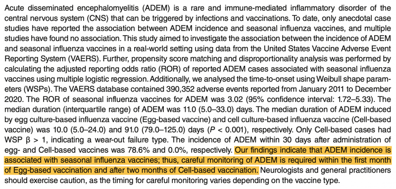 Eine japanische Studie errechnete auf der Grundlage des US-amerikanischen Meldesystems für vermutete Impf-Nebenwirkungen VAERS das Risiko, nach einer Impfung gegen saisonale Influenza ("Grippe-Impfung") eine Akute demyelinisierende Enzephalomyelitis (ADEM) zu entwickeln (Erfassungszeitraum 2011 - 2020).
