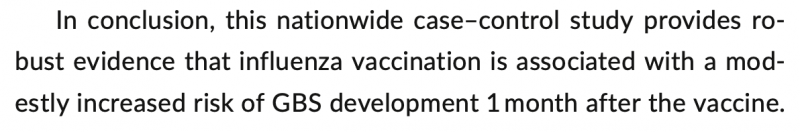 Das Risiko innerhalb eines Monats nach Influenza-Impfung zu erkranken ist dieser Studie zu Folge um den Faktor 1,9 erhöht (95% Vertrauensbereich 1,1 - 3,2).