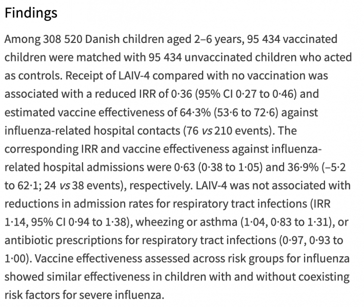 Die berechnete Impfstoff-Effektivität betrug ohnehin nur 36,9% und wies darüber hinaus noch einen absurd großen Vertrauensbereich (-5,2 bis 62,1%) auf. Die Studie zeigte auch, wie selten Kinder wegen einer Influenza im Krankenhaus behandelt werden müssen: bei mehr als 95.000 Kindern pro Studienarm geimpft/ungeimpft kam es zu lediglich 24 bzw. 38 stationären Aufnahmen (die absolute Risikoverringerung durch die Impfung beträgt mithin 0,01%). Es müssten also annähernd 7000 Kinder geimpft werden, um eine einzige stationäre Aufnahme zu verhindern.
