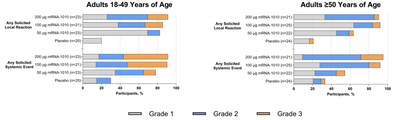 Die Nebenwirkungen waren klar dosisabhängig und schon bei der mittleren der drei getesteten Impfdosen klagten über 90% der Teilnehmer über systemische Nebenwirkungen wie Kopfschmerzen, Schwäche, Muskelschmerzen und Schüttelfrost. In der Gruppe der 18 - 49-Jährigen wurden diese Nebenwirkungen bei bis zu fast der Hälfte der Teilnehmer (47,8%) als "grade 3" klassifiziert - was eine schwere UAW mit notwendiger Hospitalisierung bedeutet. Bei den über 50-Jährigen war dies bei immerhin bei bis zu einem knappen Viertel (23,8%) der Fall.